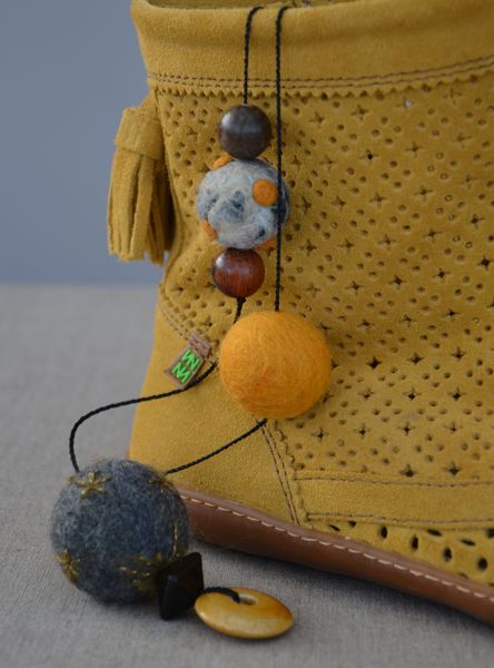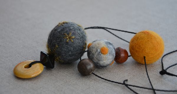 Uniquement de la laine mèche pour la perle chinée, feutrée à l’eau savonneuse. Pour les perles jaune et grise, des restes de grosse pure laine (fil à tricoter) enroulée en petite pelote bien serrée, feutrée à l’eau savonneuse, puis entourée de laine mèche feutrée à nouveau à l’eau savonneuse (pour la couleur et pour obtenir une surface uniforme).