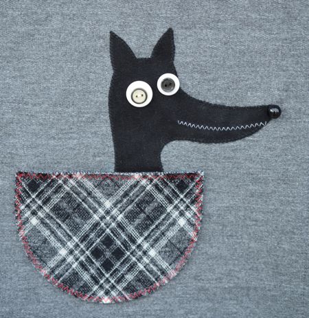 La poche est juste coupée à cru et bordée d’un zig-zag rouge. Superposition de boutons de récup pour les yeux du loup. Bouton boule pour le bout du museau. Zig-zag au fil blanc pour figurer les dents.