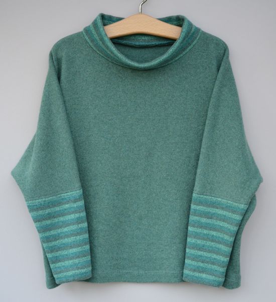 Demi-devants et demi-dos alternés en jersey et molleton gris. Manches et col en jersey, pour une exploitation maximale du coupon de jersey (de ce qui en restait utilisable…)