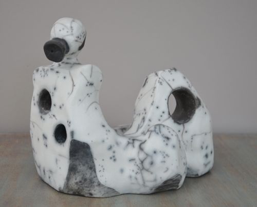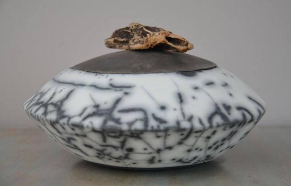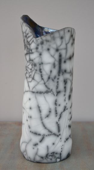Le raku nu est encore plus magique que le raku émaillé. Une fois que la couche engobe+glaçure est enlevée, on découvre la terre  toute blanche et les dessins noirs aléatoires. On peut aussi graver la couche engobe+glaçure pour « diriger » les dessins. C’est ce que j’ai tenté sur le vase : j’y ai dessiné des formes de branches, qu’on distingue assez bien.