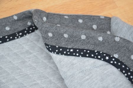 Parementures en jersey à pois (doublé de Vlieseline G785 thermocollée), bordées de biais (premier essai avec le jersey matelassé, mais je trouvais qu’il y avait trop d’épaisseur aux coutures).