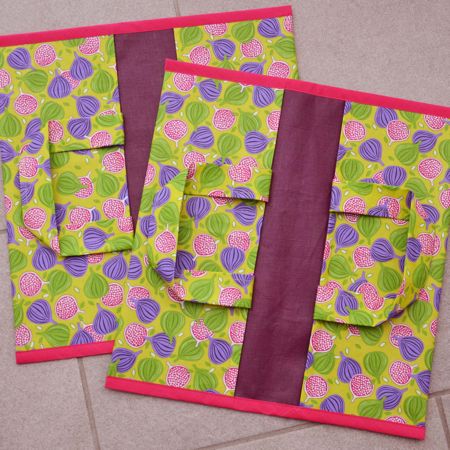 Coton enduit « figues et grenades » de Mondial Tissus (mais il ne semble plus figurer dans la collection actuelle). Biais fuchsia large de Mondial Tissus. Lin enduit du marché.