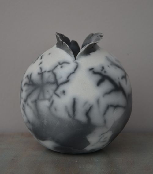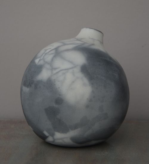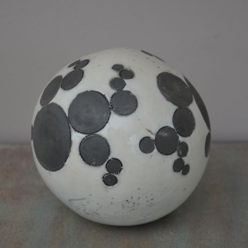 Une sphère en raku ; glaçure transparente pour le fond, ronds juste enfumés.