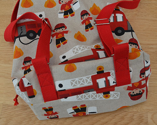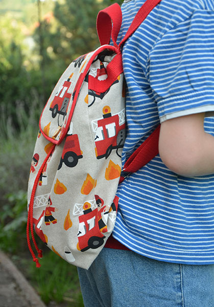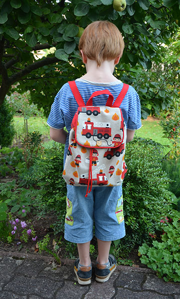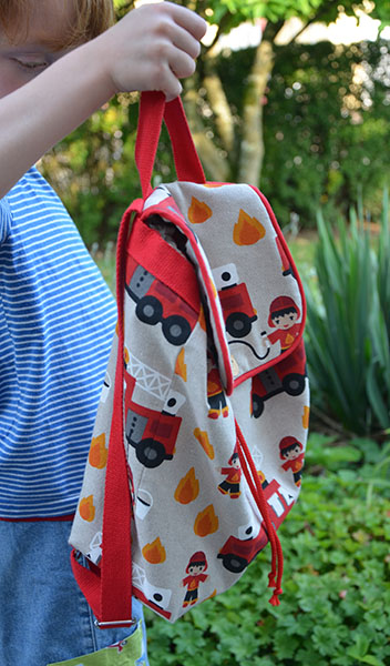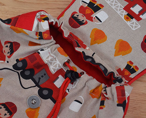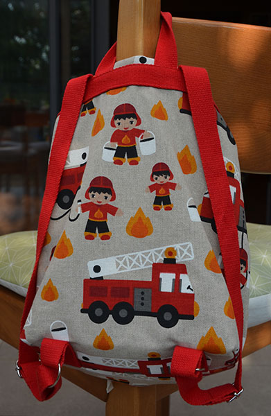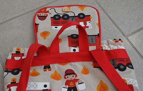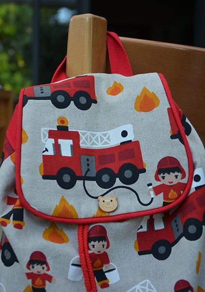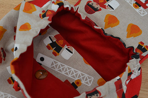 Toile « pompiers » assez épaisse de la Stoffgalerie de Sarrebruck. Doublure en coton rouge et petite poche intérieure « pompiers ».