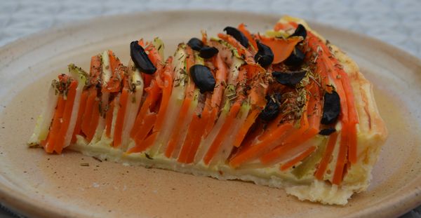 Etaler la pâte feuilletée dans un moule à tarte, puis la garnir du mélange précédent. Disposer harmonieusement les lanières de légumes en spirale en commençant au bord et en alternant les couleurs jusqu’au centre.