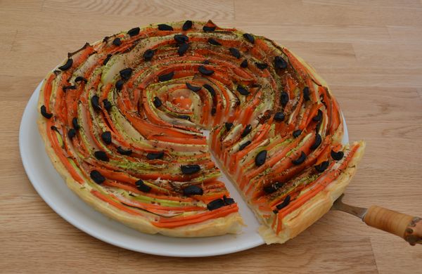 Etaler la pâte feuilletée dans un moule à tarte, puis la garnir du mélange précédent. Disposer harmonieusement les lanières de légumes en spirale en commençant au bord et en alternant les couleurs jusqu’au centre.