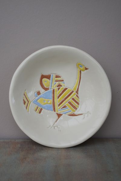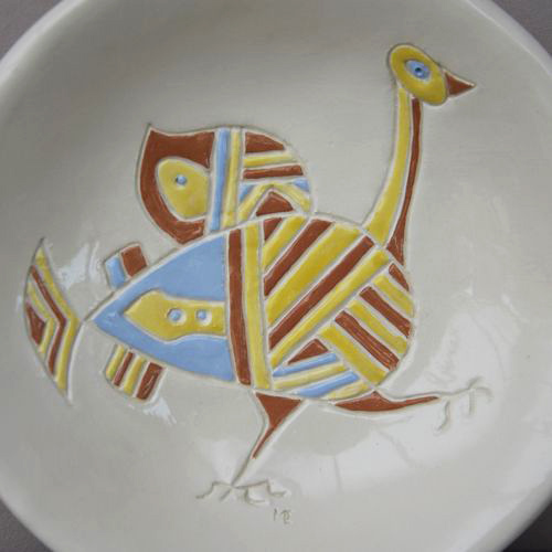 Nous avons ainsi commencé par une assiette en terre grès, juste gravée d’un oiseau stylisé.