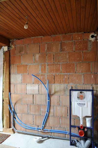 Une salle d’eau prévue à l’étage depuis… une trentaine d’années. Petite pièce à l’état brut, où tout était à faire. Notre plombier a posé tuyaux, raccords et éléments sanitaires. J’ai participé un peu à la pose du carrelage et à la peinture (et assuré l’intendance), mon mari a fait tout le reste. Un sacré boulot, qui a occupé une bonne partie de l’été et de l’automne.