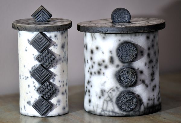 Deux boîtes cylindriques en raku nu, décorées de pastilles
