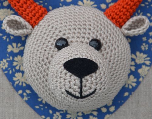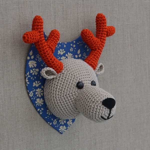 La tête et les bois sont crochetés en coton (je n’en ai plus les références), avec un crochet 3,5. Le tuto se trouve ici, offert par Anisbee.