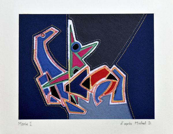 Un tableautin textile, d’après une peinture que Michel a réalisé pendant les dernières vacances d’été. A la rentrée, il avait apporté un grand carton à dessin avec toutes ses peintures de l’été, sur papier ; une sacrée production ! J’en ai profité pour les photographier, et j’en ai choisi une, en aplats, qui soit facile à interpréter avec des bouts de tissu.