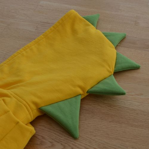 Le patron est issu du magazine Burda de janvier 2017, modèle 128, en taille 122 pour qu’il dure un peu (pour les déguisements, c’était une véritable mine, ce numéro : Schtroumpf, dinosaure, renard, Harry Potter, etc). Pour Burda, c’est un dinosaure, les loulous trouvent que c’est un dragon. Moi, je pencherais plutôt pour le dragon.