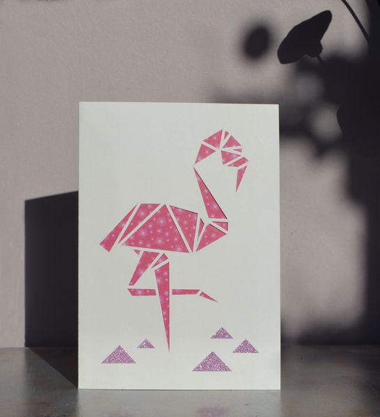 Découpage au cutter sur papier Canson, papier origami rose collé à l’arrière ; petits triangles en masking tape rose pailleté.