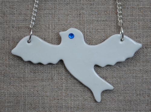 L’oiseau et les fleurettes sont découpés à l’emporte-pièce dans une fine plaque de Fimo Air (de la pâte Fimo blanche qui sèche à l’air).