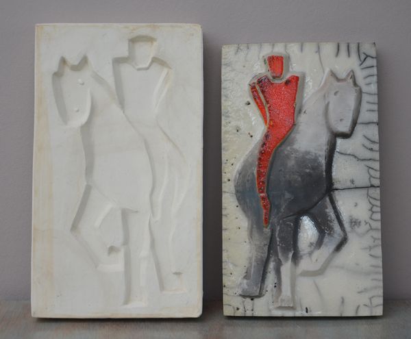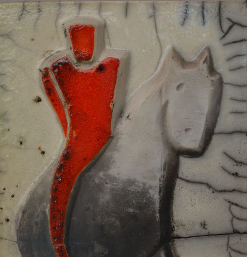 J’ai émaillé le cavalier en rouge brasier, le fond avec de la glaçure transparente, et laissé le cheval sans émail.