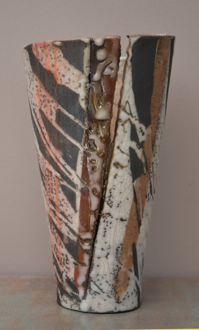 Puis, quand j’ai manipulé le vase, un morceau de la bande brune s’est cassé. J’ai colmaté le tout à l’émaillage, mais pour la fissure, cela n’a pas suffi, elle s’est encore accentuée à la cuisson raku.