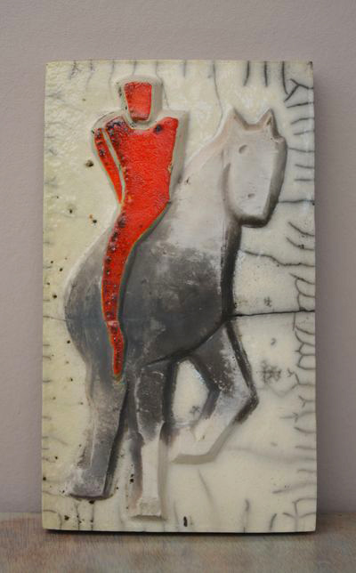 J’ai émaillé le cavalier en rouge brasier, le fond avec de la glaçure transparente, et laissé le cheval sans émail.