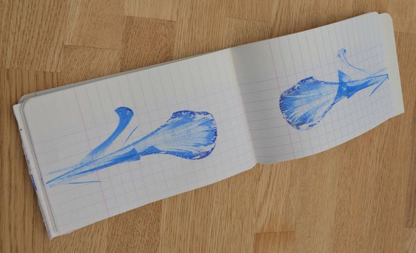 C’est tout simple, à la portée d’un enfant : on trempe un fil dans de l’encre, on le dispose sur une feuille de cahier, on referme le cahier et on tire sur le fil. Allez voir la petite vidéo chez Sakarton, elle vous explique parfaitement la méthode.