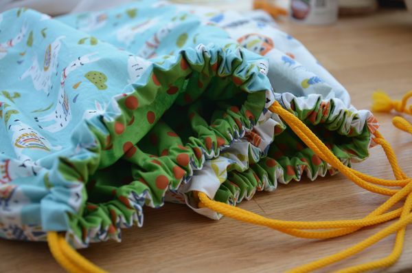 Pour chaque sac, des tissus assortis pour les deux faces (coupons de 45 cm sur 45 des Coupons de Saint Pierre, à Lille), et un tissu à pois de ma réserve pour la doublure. Cordons de Mondial Tissus.