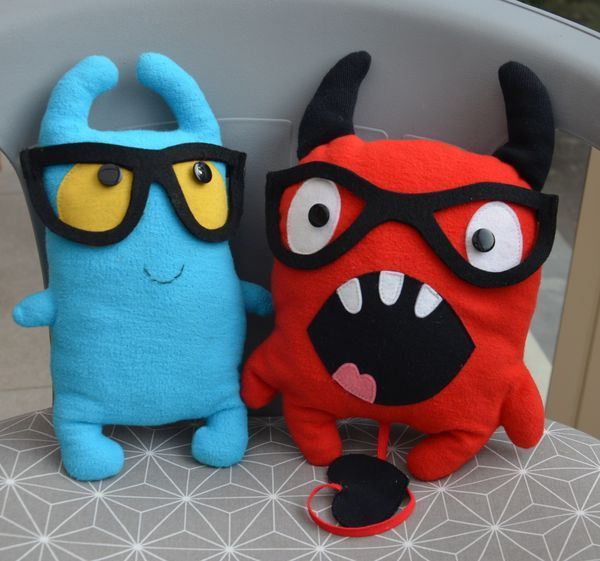 Restes de tissu pour sweat (côté duveteux utilisé pour l’endroit). Les modèles proviennent d’un magazine « Dossiers couture », « spécial doudous monstres ».