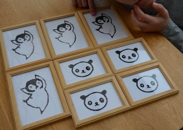 Comme les loulous aiment bien réaliser un cadeau pour leurs parents, nous avons encadré deux exemplaires. Puis, chacun a voulu aussi un cadre pour lui, Malo avec le pingouin, Maël avec le panda. Puis… Malo a dit qu’il aimerait bien un cadre avec le panda également, et Maël a bien sûr trouvé que ce serait bien d’avoir aussi un pingouin pour lui…