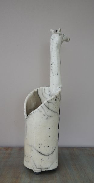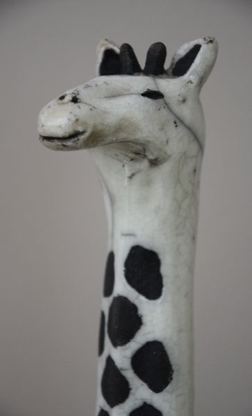 A la cuisson raku, il s’est formé diverses grosses fissures, et quand j’ai saisi mon objet refroidi, j’ai eu deux morceaux en main : le pot d’une part, le cou et la tête de la girafe d’autre part. Heureusement, la cassure était bien nette, et j’ai recollé les deux parties à la super-glue.
