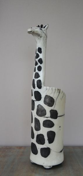 A la cuisson raku, il s’est formé diverses grosses fissures, et quand j’ai saisi mon objet refroidi, j’ai eu deux morceaux en main : le pot d’une part, le cou et la tête de la girafe d’autre part. Heureusement, la cassure était bien nette, et j’ai recollé les deux parties à la super-glue.