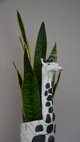 Je pensais utiliser mon pot-girafe pour ranger des ustensiles de  cuisine. Mais comme il reste assez fragile, je préfère éviter de fréquentes manipulations. Ce sera donc un porte-plante. Je la trouve assez rigolote, cette girafe qui émerge parmi de grandes feuilles vertes de sansévéria.