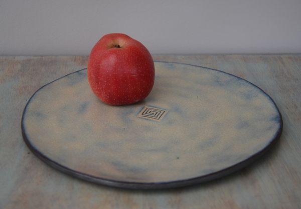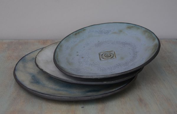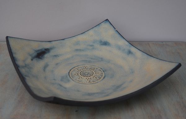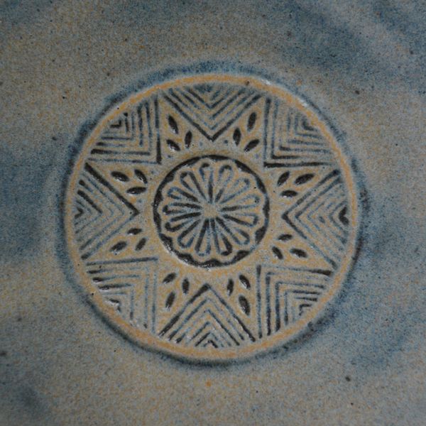 Plats, assiettes et saladier façonnés à l’atelier d’Ellen, récemment et … l’été dernier. Empreintes faites avec des tampons en bois. Ellen en a une belle collection, qu’elle met à disposition dans son atelier.