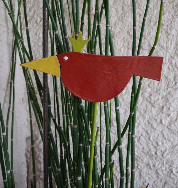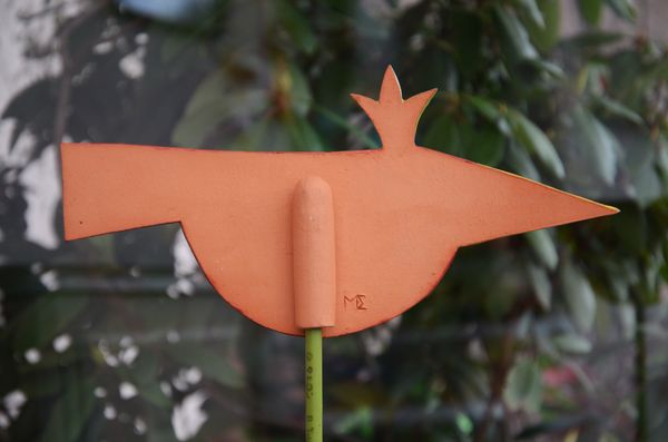 Un oiseau couronné en terre couleur terre cuite, piqué sur un tuteur à plantes.