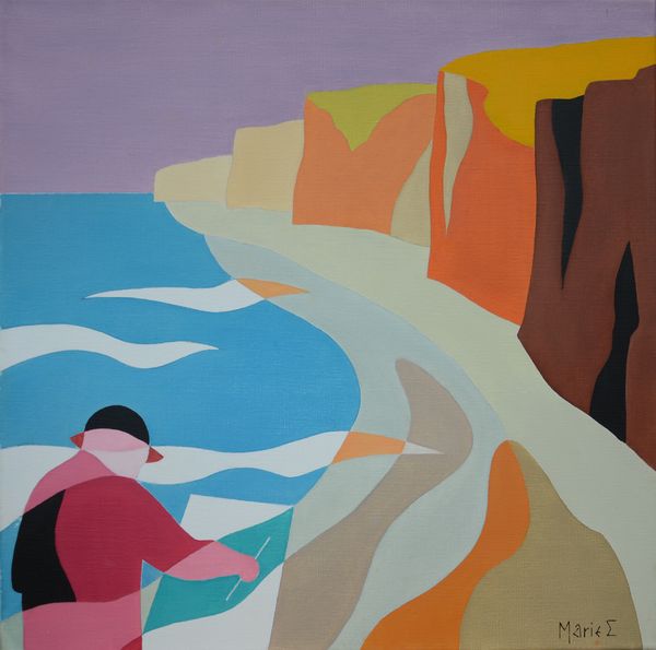 Les couleurs ont bien changé au fil de l’avancée de la toile. J’avais commencé par peindre les falaises dans un dégradé de tons ocres. Puis, pour le peintre, Michel m’a suggéré des couleurs fortes. C’est lui aussi qui m’a conseillé pour le ciel. Mais les falaises paraissaient alors bien pâles par rapport au reste du tableau. Toujours sur les conseils de Michel, j’ai repris les falaises, ainsi que la langue de terre orange. Seules les deux dernières falaises ont gardé leur couleur d’origine.