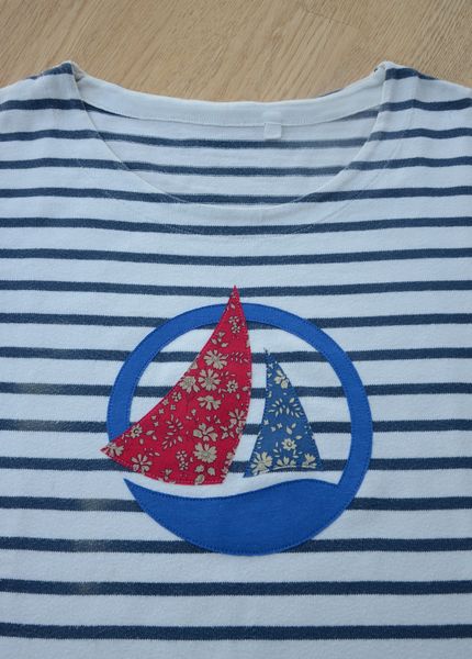 J’avais acheté, je ne sais plus où, une petite planche de motifs marins à transférer au fer à repasser, justement pour le jour où je ferai des marinières aux loulous. C’était l’occasion d’utiliser le motif bateau, qui s’accorde bien avec le bord-côte ocre des manches.