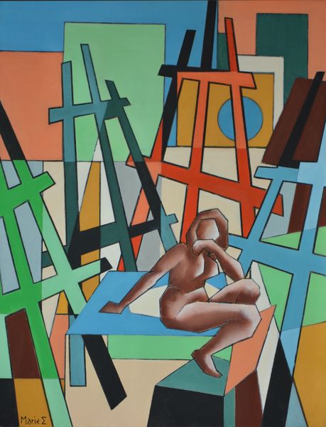 Des années plus tard, je l’ai repris. D’autres chevalets sont venus enrichir la composition. Un nu également, sur une proposition de Michel et d’après un de ses croquis. Et des couleurs vives !