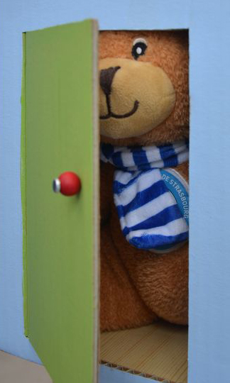 Une maison en carton pour les doudous de Maël. Gros-oeuvre fait par mamie et papy. Le toit est solidaire des deux pignons triangulaires et amovible.