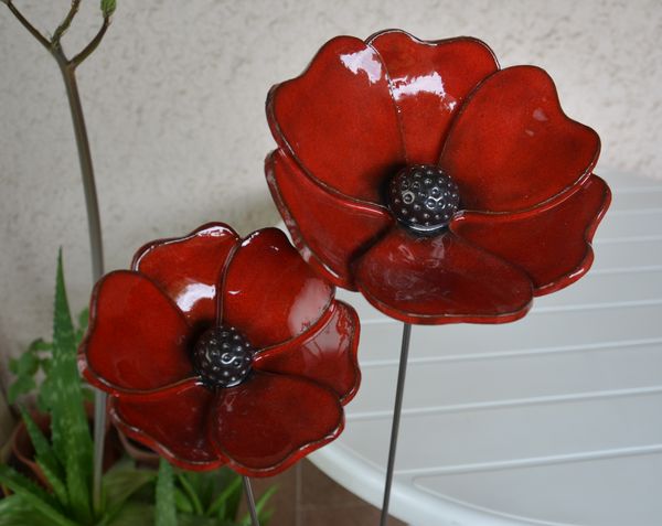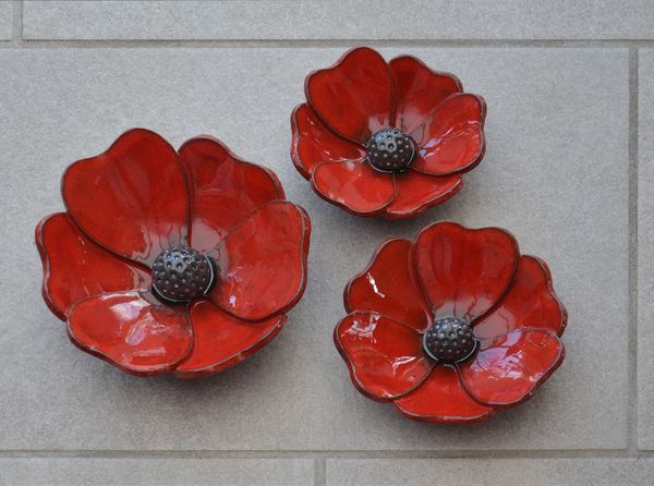 Trois coquelicots en terre rouge émaillée, mis en forme dans des moules demi-sphériques de diamètres 20, 18 et 15 cm.