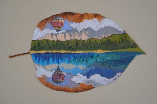 Peinture à l’acrylique sur une feuille séchée (de renouée, je pense), de belles dimensions (environ 20 cm sur 14).