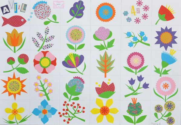Puis… quand on commence à découper, on ne peut plus s’arrêter… Chaque petite fleur appelait la suivante. Le 9, le collage d’avril était bouclé.