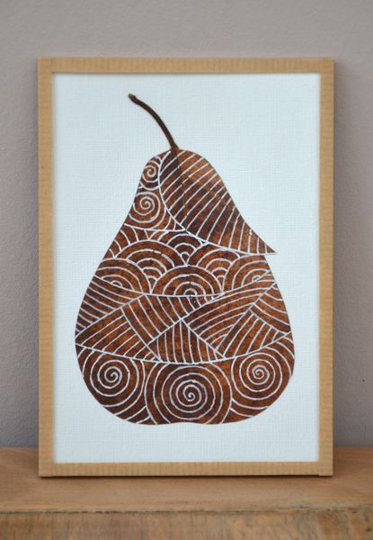 Sur une feuille de renouée séchée (que j’ai renforcée de Vliesofix à l’arrière, pour qu’elle soit moins fragile), j’ai esquissé une poire, puis je l’ai découpée et j’ai dessiné des motifs au feutre Posca blanc.