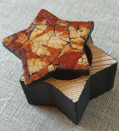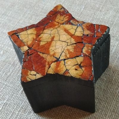J’ai utilisé de la colle à bois pour coller les morceaux de coquille. Une fois que le tout a été bien sec, j’ai badigeonné de la peinture acrylique noire que j’ai essuyée aussitôt, pour ne la laisser que dans les fissures. De la peinture noire également sur l’extérieur de la boîte et, pour finir, une couche de vernis brillant sur le dessus.
