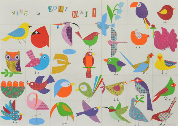 Adorable set avec les oiseaux, belle imagination pour en faire autant de différents (même si dans la vie, il y en a des milliers différents …). Bravo pour la carte à Malo, qui est stylisée comme certains de tes tableaux (si je ne me trompe pas !)
