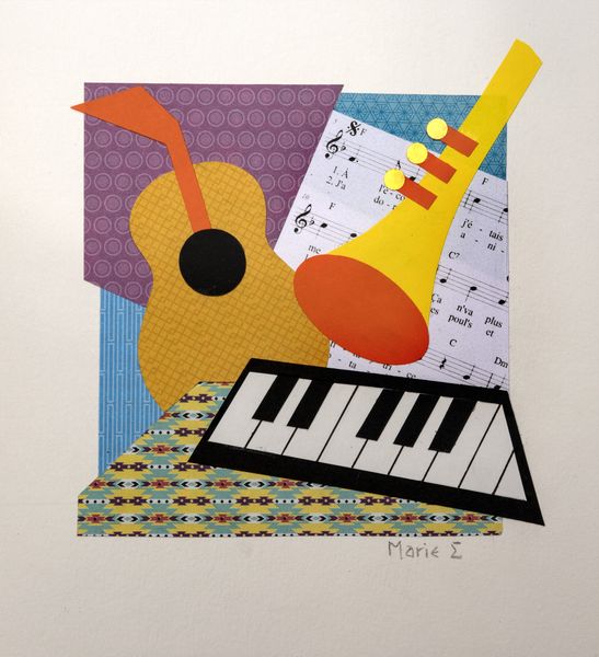 Un dessin préparatoire d’abord, puis report des différentes formes sur du papier calque, découpage, report sur les papiers colorés, re-découpage et collage.