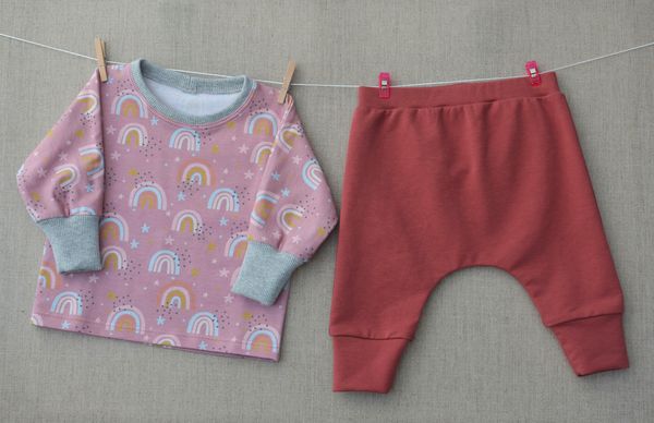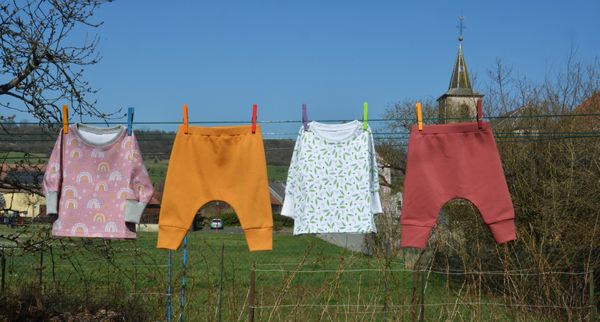 Un T-shirt et deux leggings, qui peuvent s’assortir avec l’un ou l’autre des deux petits hauts (celui-ci, et celui que j’ai fait précédemment).