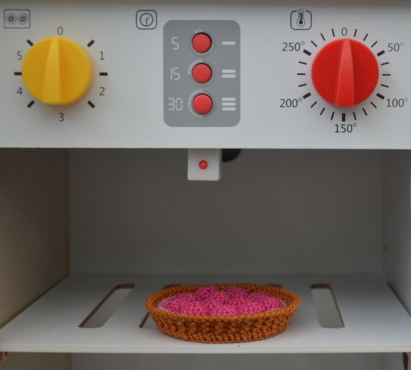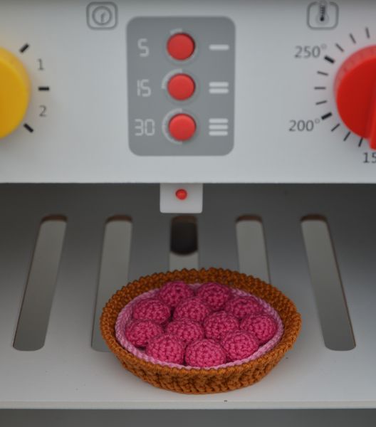 Pour les tartes, il y a deux propositions dans le livre : les différents éléments cousus les uns aux autres ou non. Je préfère la version « à assembler ». Lison pourra composer ses tartes comme elle en aura envie.
