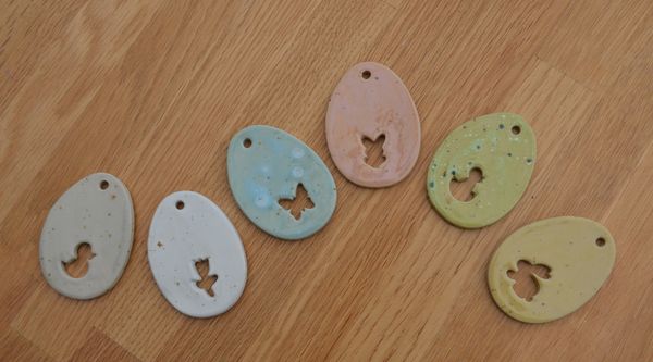 Des oeufs à suspendre… à Pâques ! La potière dont je fréquente l’atelier un jeudi sur deux a une foule d’émaux et plein d’emporte-pièce de toutes formes, petits et grands. Il faut que j’en profite encore cette année, elle arrêtera son activité fin décembre.