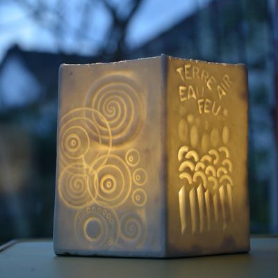 Un second essai (avec de la porcelaine papier toute prête), photophore cylindrique avec empreinte de petites japonaises (une ribambelle sur un même tampon en longueur). Pas mal, pas de surépaisseurs cette fois… Même pas de biscuitage, une seule cuisson à 1250°.