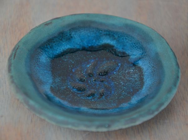 Sur une surface bien plane (j’ai utilisé une plaque de verre), poser un morceau de feutrine, puis le papier à imprimer préalablement humidifié (je l’ai laissé tremper quelques minutes dans une assiette remplie d’eau, puis soigneusement essuyé), enfin la plaque gravée (côté alu sur le papier évidemment). On peut rajouter une feuille pour protéger le tout. Passer et repasser plusieurs fois sur le « sandwich » avec un rouleau à pâtisserie (j’ai utilisé mon rouleau de potier, parfaitement lisse), en appuyant très fort, mais en prenant bien garde à ne rien déplacer.