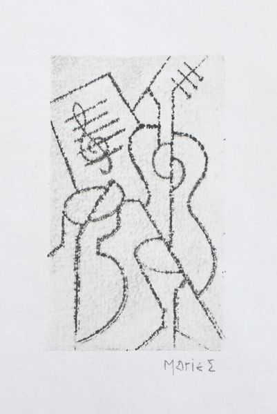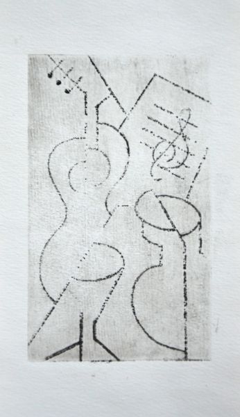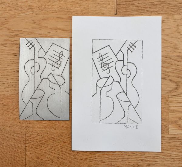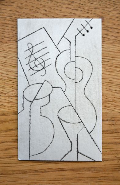 J’ai reporté le dessin sur la plaque avec du papier carbone et j’ai utilisé une pointe sèche pour gravure (du Géant des Beaux Arts), mais n’importe quelle pointe doit pouvoir faire l’affaire (pointe de compas, aiguille fichée dans un bouchon, etc).