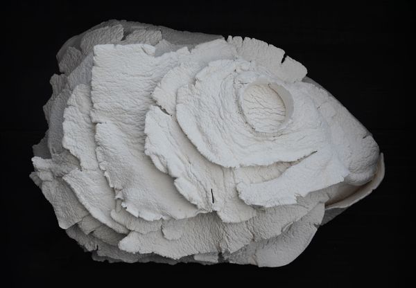 En fait, depuis la rentrée du second semestre, le programme avait été un peu chamboulé. Gilles ayant eu un problème de tendon, son collègue l’a remplacé pendant quelques semaines. Entre autres sujets, il nous avait proposé de réaliser une demi-tête de poisson, en nous inspirant de l’oeuvre ci-dessous du céramiste Dominique Bajard.