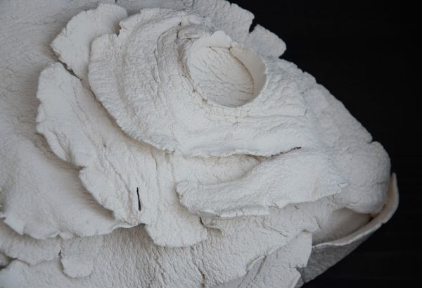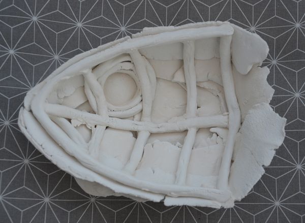 Techniquement, il s’agissait de construire une structure en colombins, et de la recouvrir de « peaux de terre », c’est-à-dire des morceaux de terre qu’on jette sur la table, plusieurs fois, pour les amincir. Il se forme alors des textures intéressantes, la terre se fendille, se fissure…